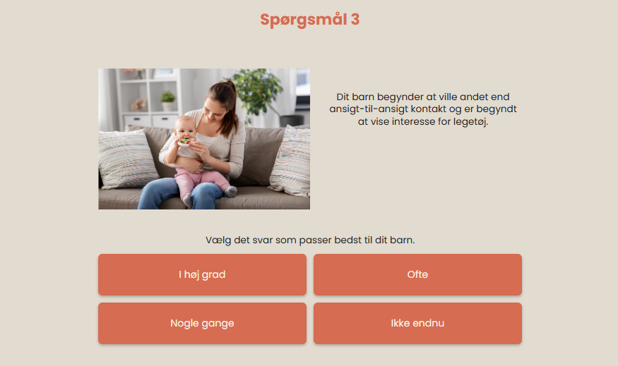 ”Mit barns udvikling – 4 måneder” består af 19 udsagn, hvor du har mulighed for at reflektere over, hvordan du oplever dit barns udvikling – inden for områder som: