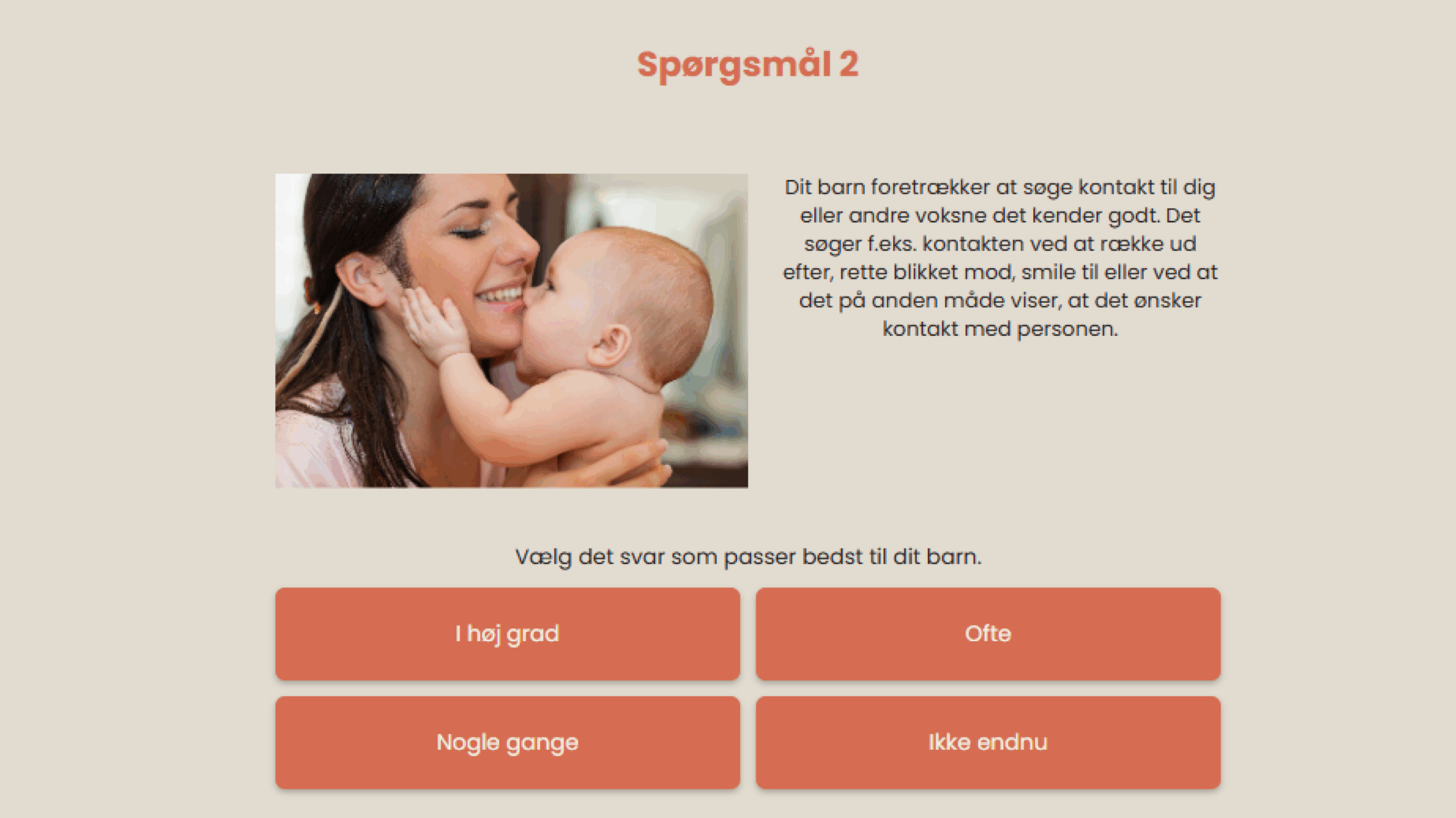 ”Mit barns udvikling – 8 måneder” består af 17 udsagn, hvor du har mulighed for at reflektere over, hvordan du oplever dit barns udvikling – inden for områder som: