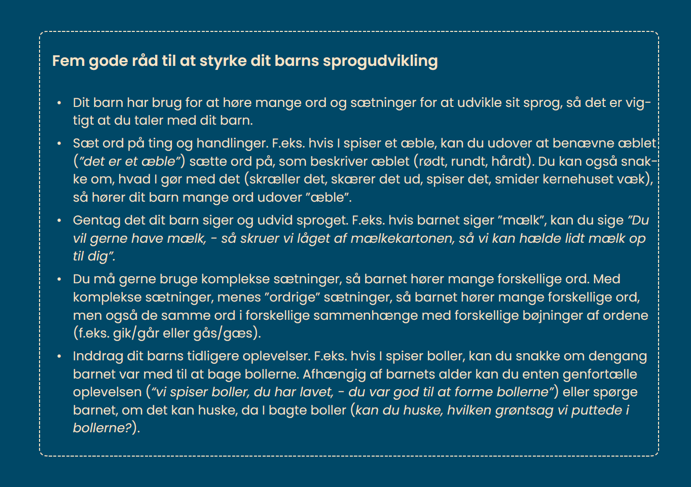 - forslag til lege og aktiviteter, som passer til den udvikling, hos barnet, du læser om.